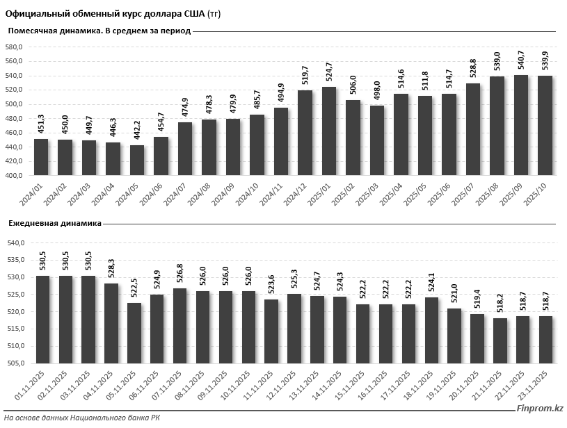 Средний курс доллара в октябре находился на уровне 539,9 тенге, а к 23 ноября опустился до 518,7 тенге.