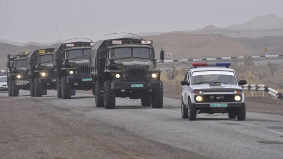 "В рамках совместного антитеррористического учения "Каспий- Антитеррор-2021", проводимого под эгидой Антитеррористического центра СНГ, на территории Мангистауской области пограничной службой проводится перегруппировка своих подразделений. Передвижение колонн техники осуществляется в сопровождении военной полиции", – сообщила пресс-служба КНБ.