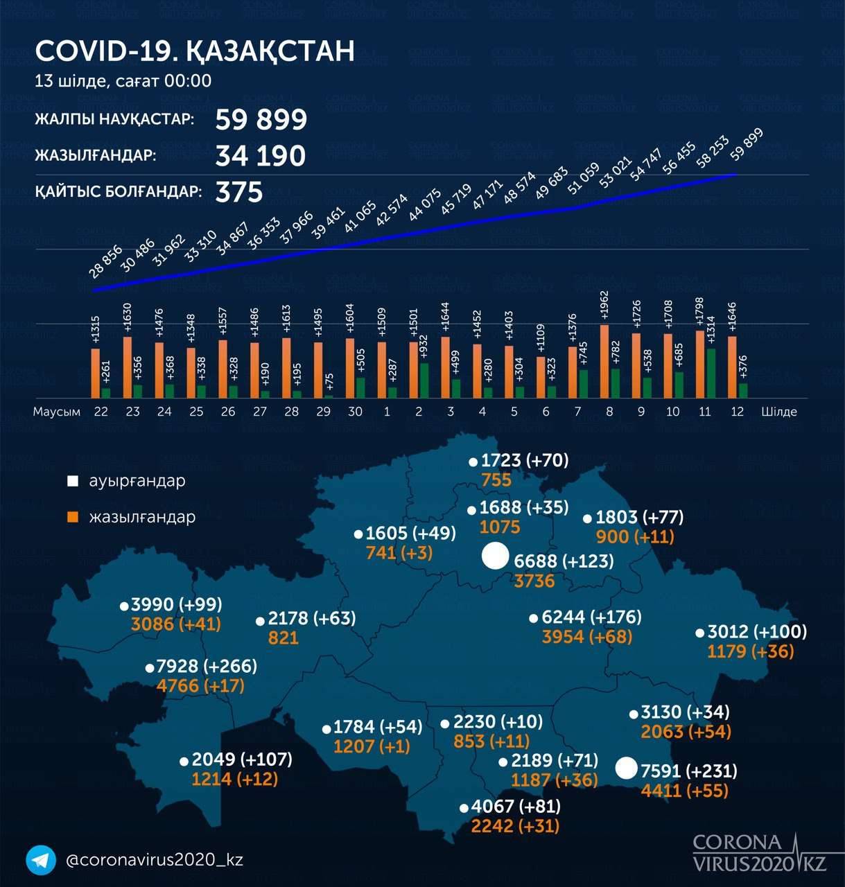 Covid-19 жұқтырғандар саны 59 899-ға, қайтыс болғандар саны 375-ке жетті.