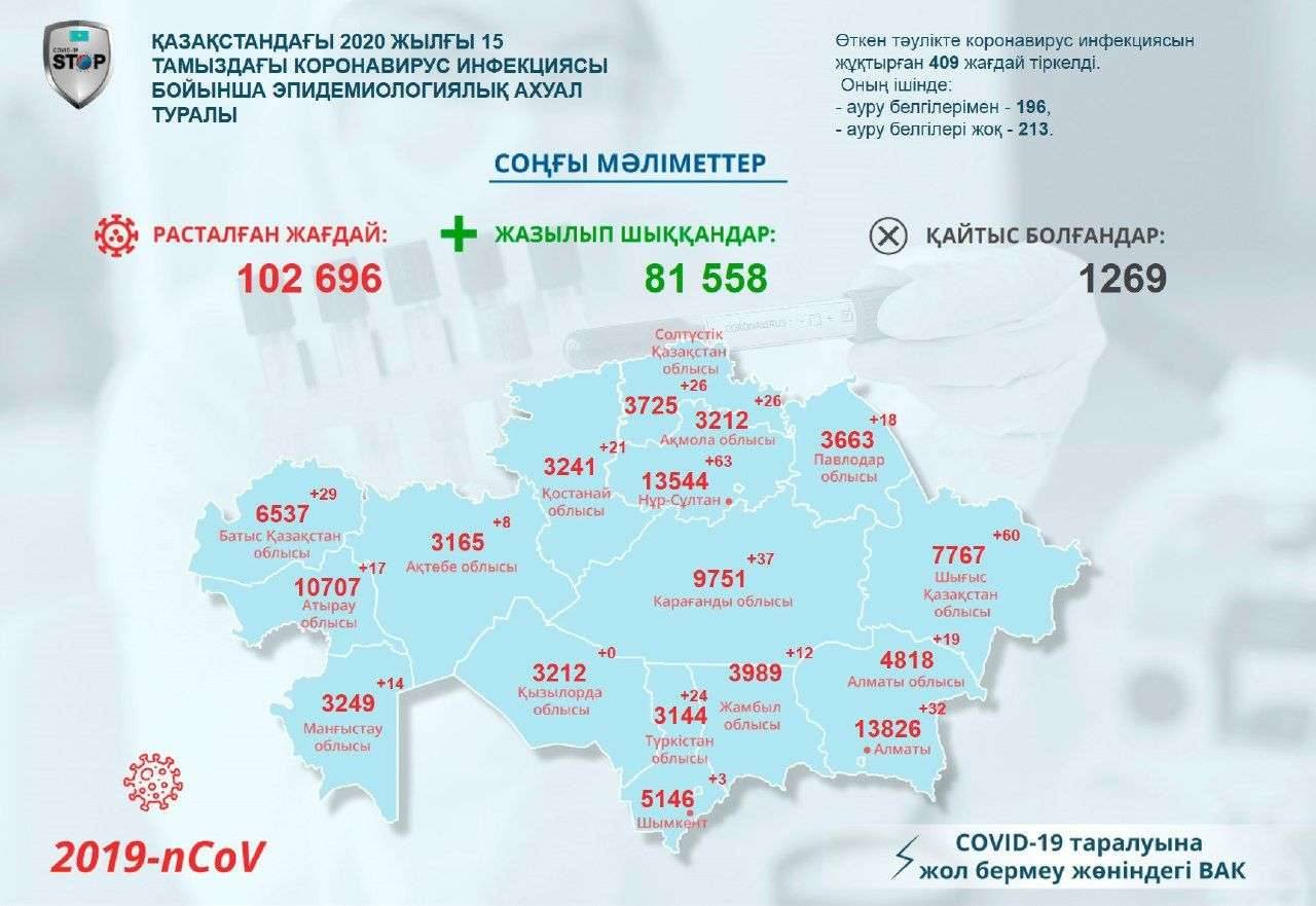 Қазақстанда өткен тәулікте коронавирус инфекциясын жұқтырған 409 адам (ауру белгілері барлар – 196, жоқтар – 213) тіркелді.