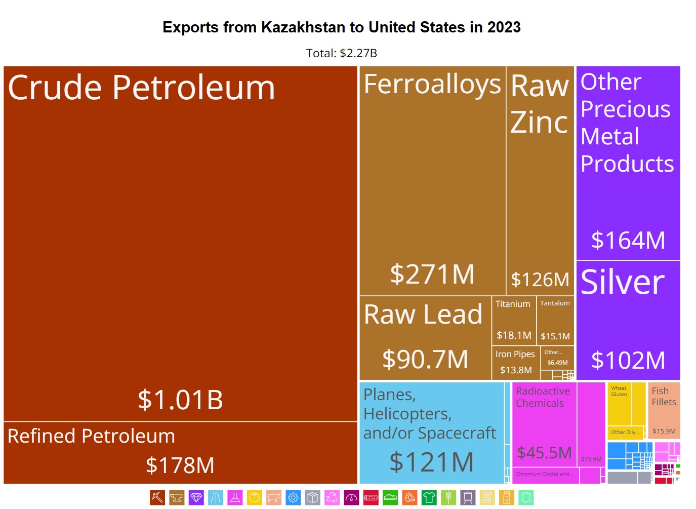 Атап айтқанда, шикі мұнай – 1 миллиард 10 миллион доллар, өңделген мұнай өнімдері – 178 миллион доллар, ферроқорытпалар – 271 миллион доллар, мырыш – 126 миллион, қорғасын – 90,7 миллион, титан – 18,1 миллион, тантал – 15,1 миллион, темір құбырлар – 13,8 миллион доллар болды. Қымбат металдар тобы бойынша, күміс – 102 миллион, ал платина, палладий, алтын, иридий, осмий секілді асыл металдарды қамтитын басқа да бағалы металл өнімдері – 164 миллион доллар көлемінде экспортталған. Радиоактивті химиялық өнімдер, соның ішінде уран – 45,5 миллион долларды құрады.