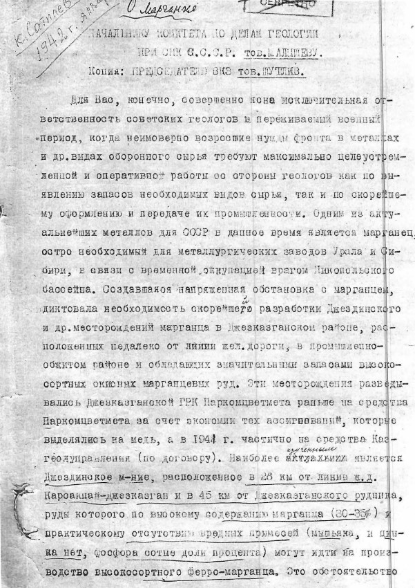 Алайда, Жездіні барлау тапысырлған ғалымдар ондағы марганец көлемін нақты көрсетуге қорыққан. Себебі, ол заманда, соғыс кезінде байқаусызда жалған ақпарат беріліп қойса, ғалымға басымен жауап беруге тура келетін. Сол кезде де Қаныш Сәтбаев кен орнының қоры шамамен қанша екенін, қанша бөлігін жерасты әдісімен, қанша бөлігін ашық әдіспен өндіруге болатынына дейін тәптіштеп есептеп берген. Бұл хабар Сталинге жеткенде ол бірден Жезді кенін игеруге тапсырма берді. Өйткені, марганецсіз құрыш құйылмайды.