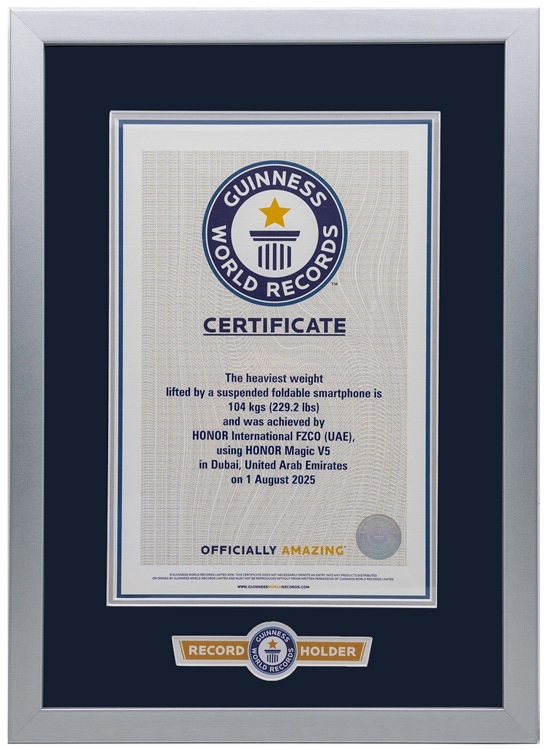 Жаңа Honor Magic V5 жиналмалы смартфоны ең берік смартфон ретінде Гиннесс рекордтар кітабына енді. Өзінің жұқа болғанына қарамастан, смартфон тәжірибе кезінде 104 келі жүкке төтеп берген. Атап айтқанда, смартфонға алдымен салмағы 84 келі тоңазытқыш ілініп, бұл аздық еткендіктен, оған қоса тағы 20 келі металл пластиналар ілінген.