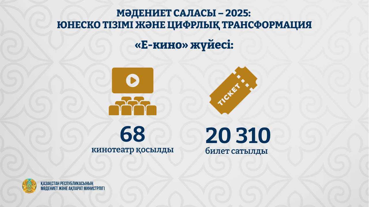 Жылдың тағы бір маңызды жобасы – "E-кино" жүйесі, ол кинотеатрлардағы көрсетілімді біртұтас цифрлық есепке алады. Платформаға 68 кинотеатр қосылған. Жүйе арқылы 20310 билет сатылды. Жоба нарықтағы ашықтықты арттырып, ұлттық кино жұмысын талдауға мүмкіндік береді.