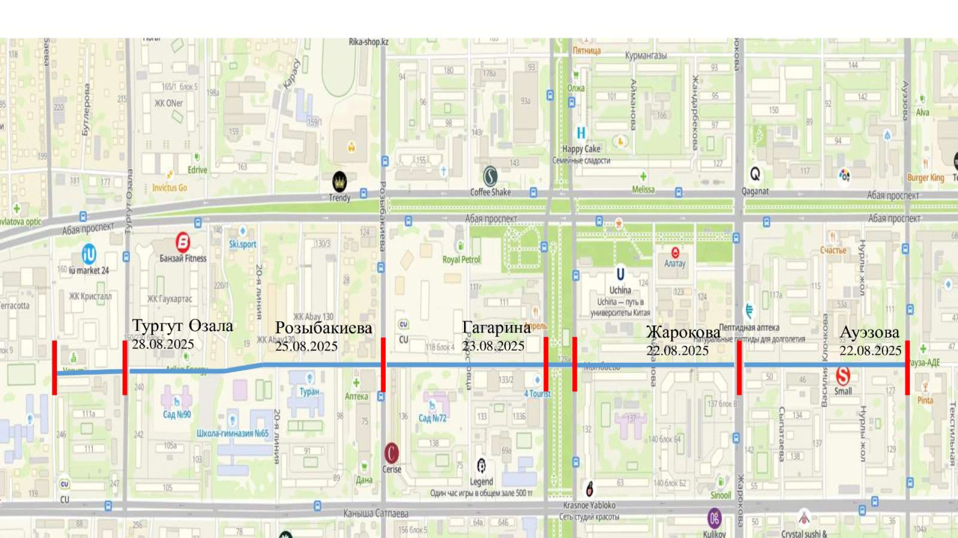 - 25–28 тамыз аралығында жабылады: Тұрғыт Озал көшесі, Абай даңғылы мен Сәтбаев көшесінің арасындағы бөлік.