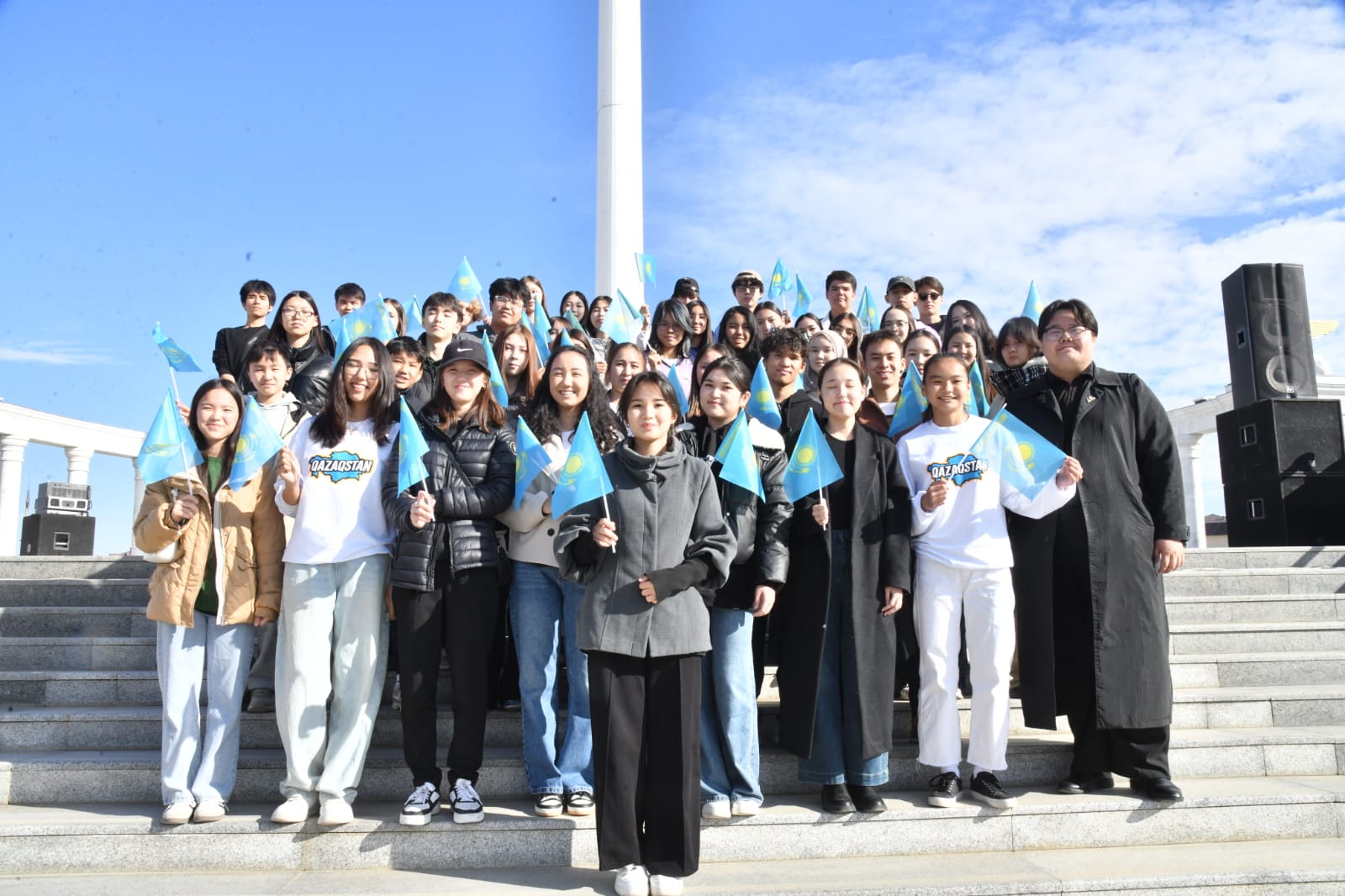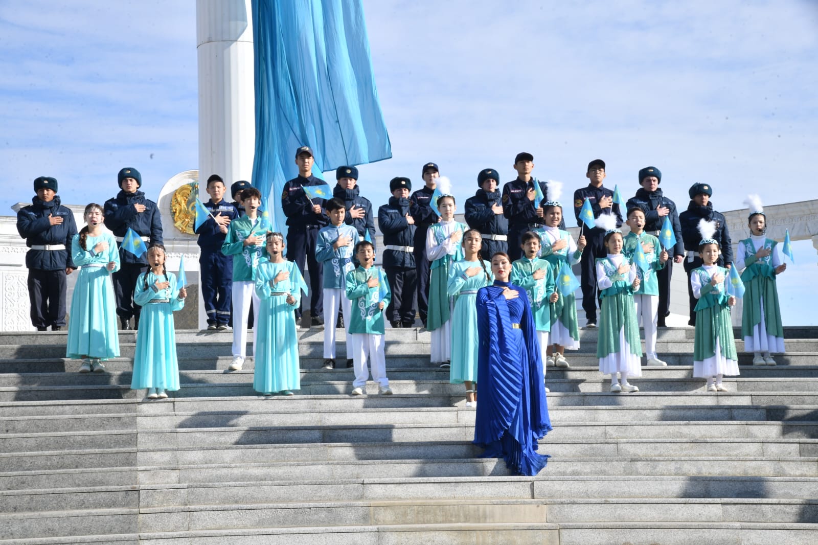 Мемлекеттік гимн орындалуымен биіктігі 91 метр болатын тұғырға көк байрақ көтеріліп, аспан астында байрағымыз желбіреді.