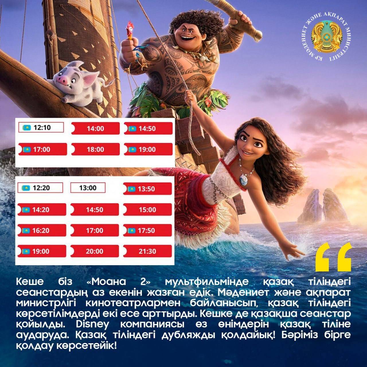 "2024 жылдың 28 қарашасынан бастап елімізде Disney компаниясының "Моана 2" анимациялық фильмі көрсетілуде. Сонымен қатар, биыл алғаш рет Disney мен Pixar студиялары "Ойжұмбақ 2", Disney студиясы, "Муфаса: Арыстан патша" деп аталатын анимациялық фильмдерін өз қаражатына қазақ тіліне аударды. Айта кету керек, осы бастамалардың арқасында қазақтілді сеанстар саны екі есеге артты. Бұл қазақ тілінің және мәдениетінің жастар арасында танымал болуына, сондай-ақ ұлттық тіл мен мәдениетті сақтау мен дамытуға үлкен үлес қосуда", – делінген министрліктің хабарламасында.