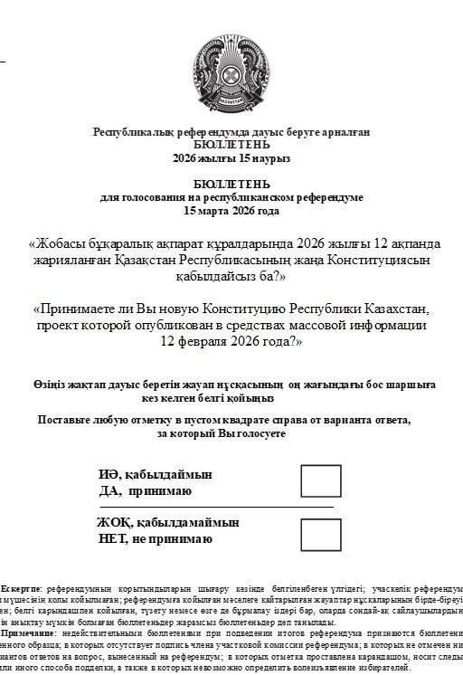 "Жобасы бұқаралық ақпарат құралдарында 2026 жылғы 12 ақпанда жарияланған Қазақстан Республикасының жаңа Конституциясын қабылдайсыз ба?"