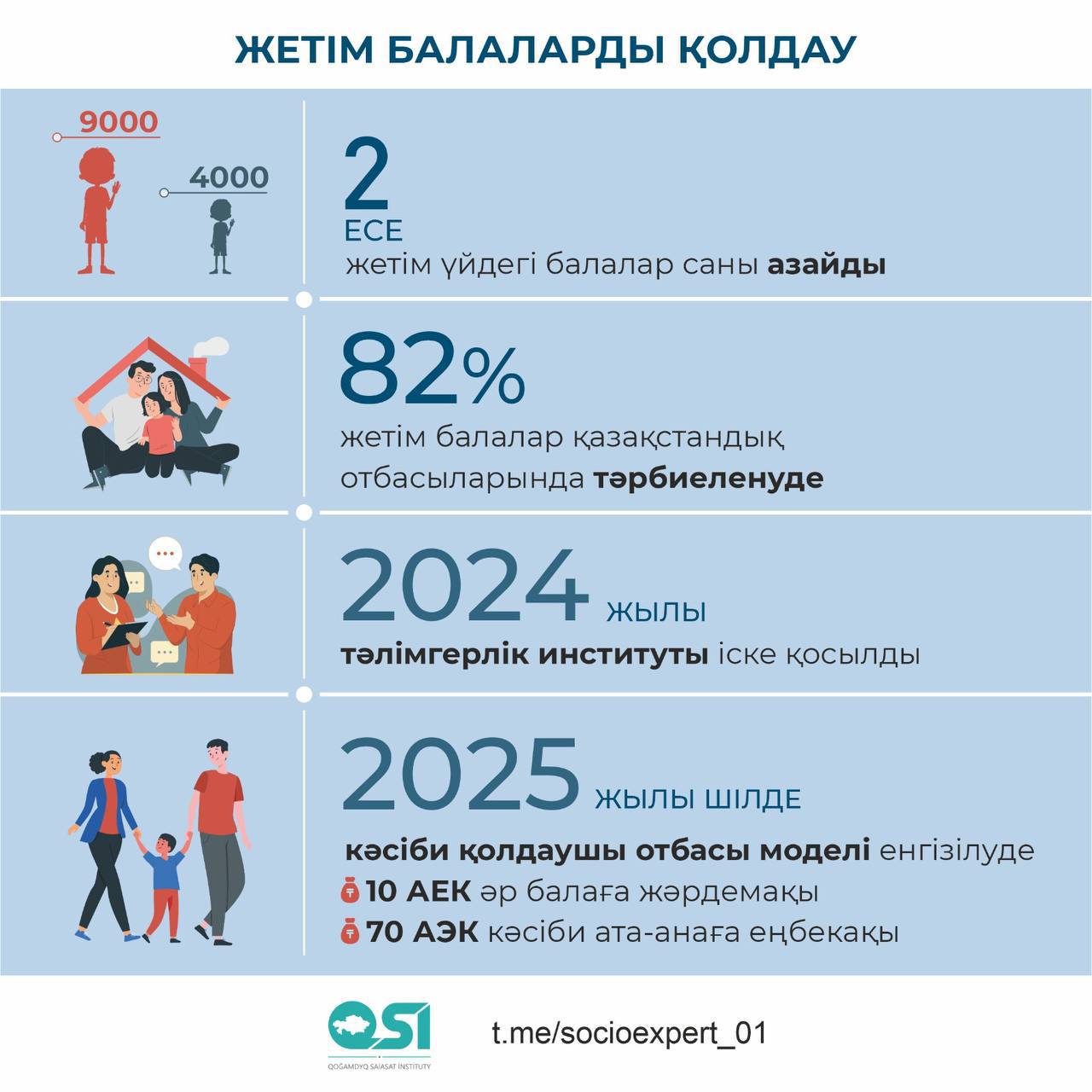 2024 жылдың басындағы ресми деректерге сәйкес, Қазақстанда 21 387 жетім және ата-ананың қамқорлығынсыз қалған бала тіркелген. Оның 17 660-і (82%) қазақстандық отбасылардың қамқорлығына (қамқоршылық, патронат, асырап алу және т.б.) берілген. Соңғы 10 жылда жетімдер үйлеріндегі балалар саны 9 мыңнан 4 мыңға дейін азайған, яғни 65%-ға төмендеді. Балалар үйінің саны да едәуір қысқарды.