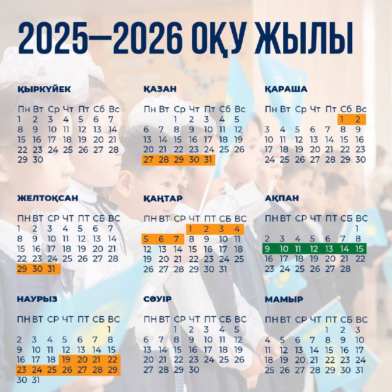 Оқу-ағарту министрлігі 2025-2026 оқу жылындағы каникул кестесін жариялады. Оған сәйкес, оқу 2 қыркүйекте басталып, 2026 жылғы 25 мамырда аяқталады.