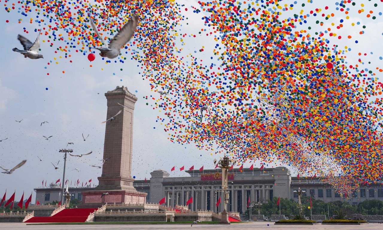 ҚХР төрағасы Си Цзиньпиннің шақыруымен 26 мемлекет пен үкімет басшысы салтанатты шараларға қатысты. Қытай өзге халықтармен бірге Екінші дүниежүзілік соғыстағы жеңістің қорытындыларын қорғайды. Бұл ретте Қытай БҰҰ бекіткен халықаралық жүйені, халықаралық құқыққа негізделген халықаралық тәртіпті қолдайды және бейбітшілік пен дамуға жол салады.