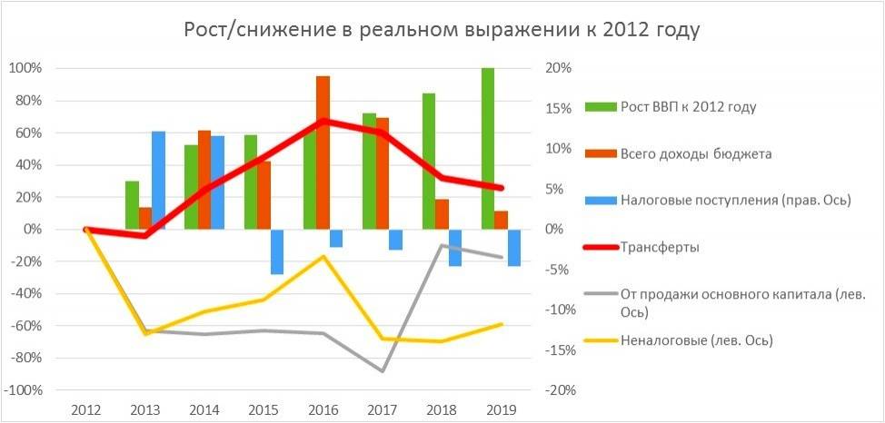 В качестве базового года я выбрал 2012 год, потому что в тот момент кризис 2008-2009 был уже позади, а до пертурбаций 2014-2016 годов (девальвации, падение цен на нефть, ЕАЭС, геополитические напряжения) ещё далеко. Данные взяты с сайта Министерства финансов РК .