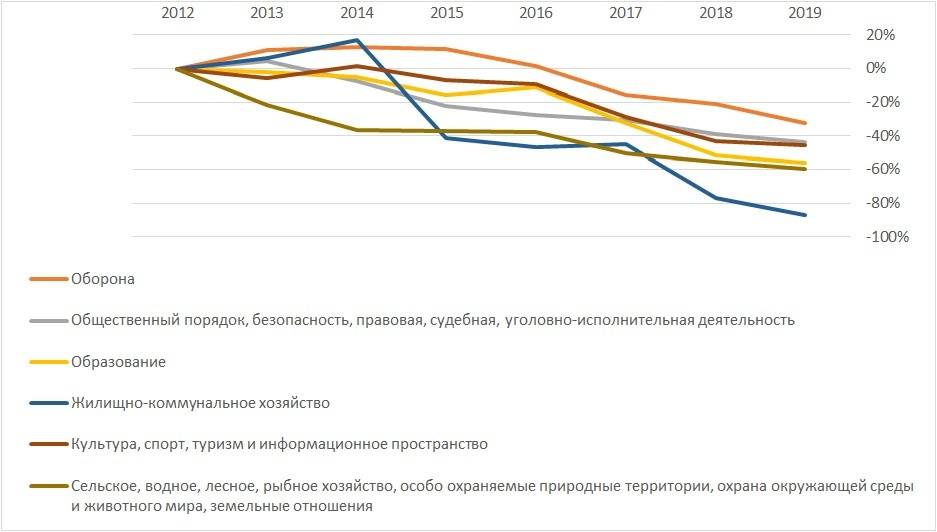 Рост расходов на обслуживание долга, соцобеспечение и здравоохранение достигается за счёт системного снижения расходов на оборону, поддержание общественного порядка, судебную и уголовно-исполнительную деятельность, а также образование, культуру, ЖКХ и окружающую среду. Особенно показателен тот факт, что существенное падение по этим статьям происходит после 2016 года.