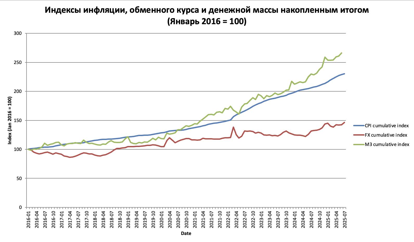 На графике внизу видна динамика накопленной инфляции и роста количества денег, видно невооружённым глазом отставание курса. И пока я полагаю, что плавное сползание к базовому уровню 540–560 с отклонениями вверх и вниз становится новой реальностью. В следующем году доллар будет забирать ещё по 6–8%, то есть около 40–50 тенге, и мы выйдем к 2027 году на базу под 600.