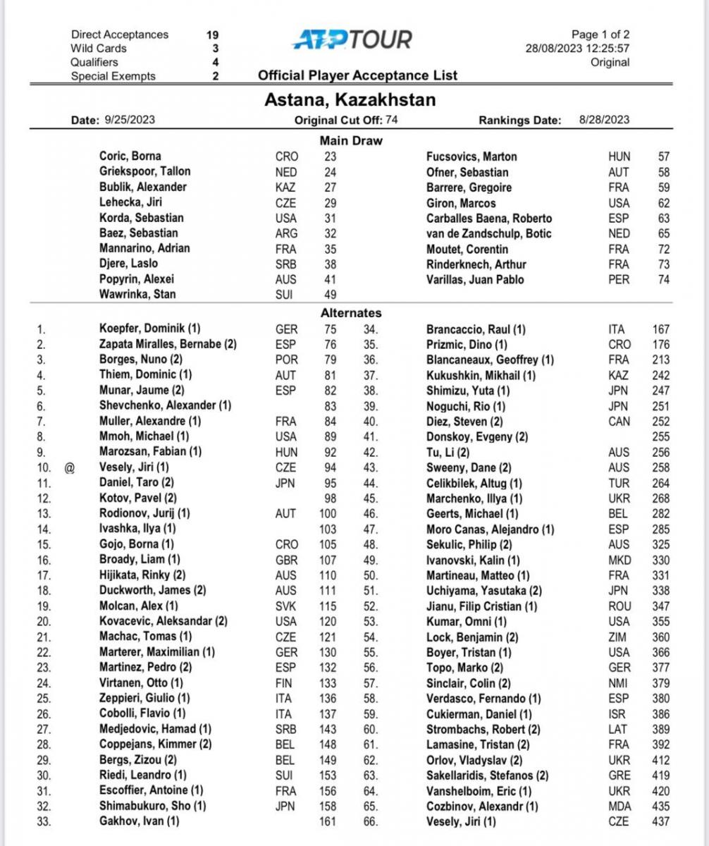 В столице Казахстана также сыграют француз Адриан Маннарино (35 АТР), серб Ласло Джере (38 АТР), Алексей Попырин (41 АТР), швейцарец Стэн Вавринка (49 АТР).