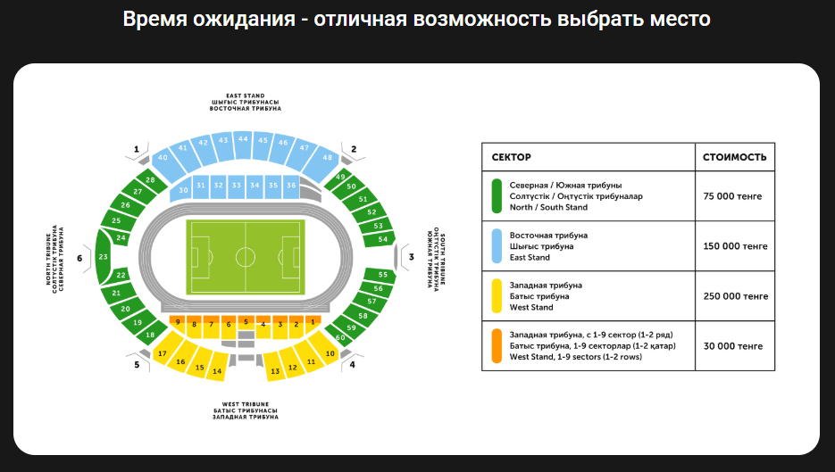 Также на сайте представлена схема стадиона с указанием цен: от 30 тысяч до 250 тысяч тенге за билет.