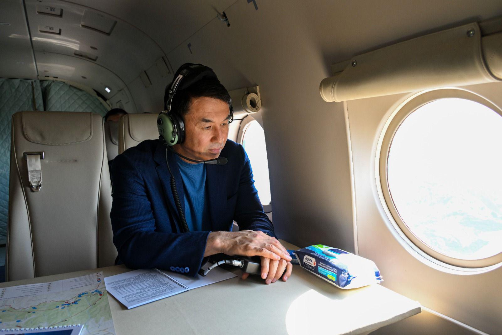 Глава Алматы Дархан Сатыбалды с вертолёта осмотрел состояние моренных озёр, расположенных в бассейнах рек Ақсай, Кіші и Үлкен Алматы, и селезащитной инфраструктуры: плотин "Медеу", "Үлкен Алматы", "Қарғалы", сообщает пресс-служба акимата мегаполиса.