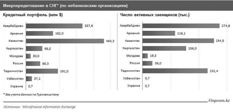 Казахстанский рынок микрокредитования оказался самым крупным на территории стран СНГ. Данные международной организации Microfinance Information Exchange показывают, что РК формирует порядка 33% совокупного кредитного рынка микрозаймов, это 464,3 млн долларов. Исследование опубликовано на сайте аналитического агентства Finprom.