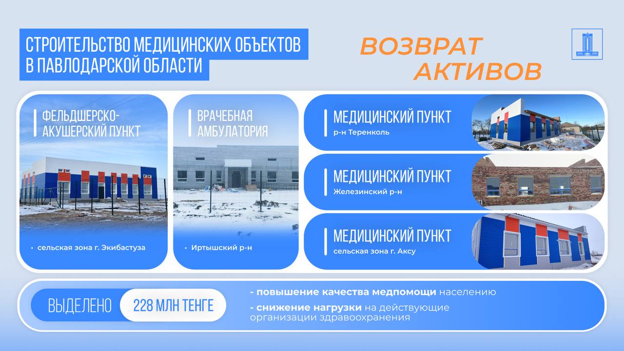 228 млн тенге из возвращённых активов потратят на строительство медицинских объектов в сёлах Павлодарской области, сообщила пресс-служба правительства.