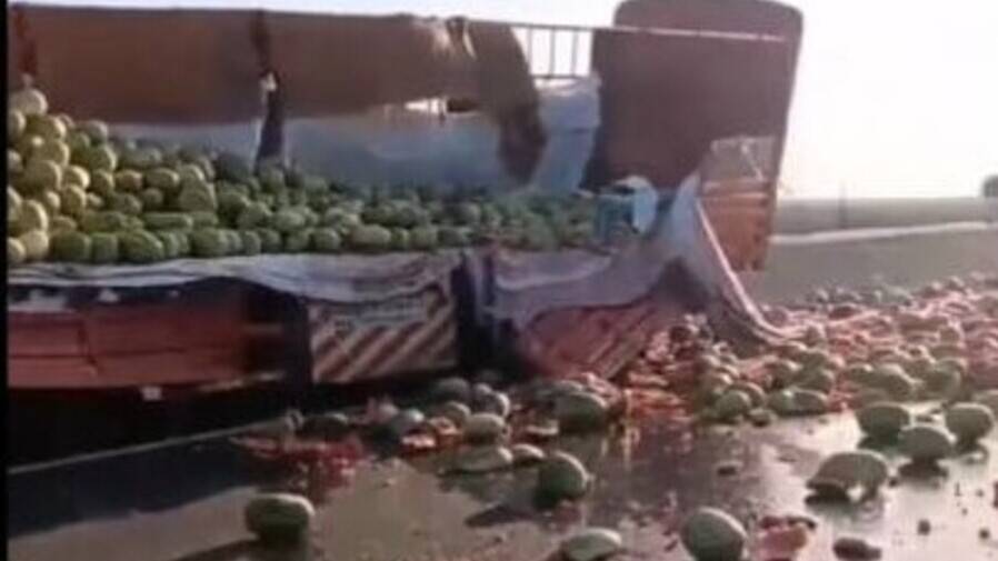 Грузовик с прицепом следовал по трассе Западная Европа – Западный Китай. Шёл дождь, 28-летний водитель не справился с управлением, и фура опрокинулась. В результате все арбузы рассыпались по дороге.