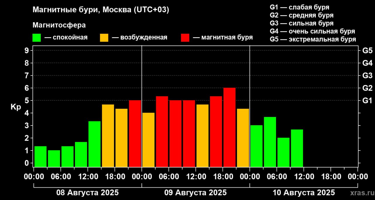 "По состоянию на утро 10 августа геомагнитная обстановка полностью стабилизировалась. На настоящий момент геомагнитные индексы уже около 10 часов находятся в зелёной зоне. Земля при этом продолжает находиться в зоне действия наблюдающихся на Солнце корональных дыр. Скорость солнечного ветра сейчас повышена примерно на 50 % по сравнению с нормальными значениями. Наблюдаются скачки температуры и индукции межпланетного магнитного поля. Поэтому сохраняются риски геомагнитных возмущений, которые будут присутствовать до середины будущей недели, когда из-за вращения Солнца корональные дыры переместятся в западному краю звезды, откуда перестанут оказывать влияние на Землю", – говорится в сообщении.