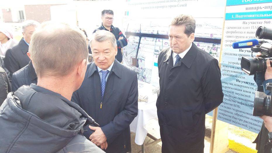 Даниал Ахметов побывал на ремонтной площадке семейского аэропорта и уточнил у представителя сербской компании Planum (Сuprus) Limited, какую технику они собираются использовать для качественной укладки бетона. В ответ представитель компании Сергей Фёдоров заверил акима, что в аэропорт уже завезён современный бетоноукладчик немецкого производства.