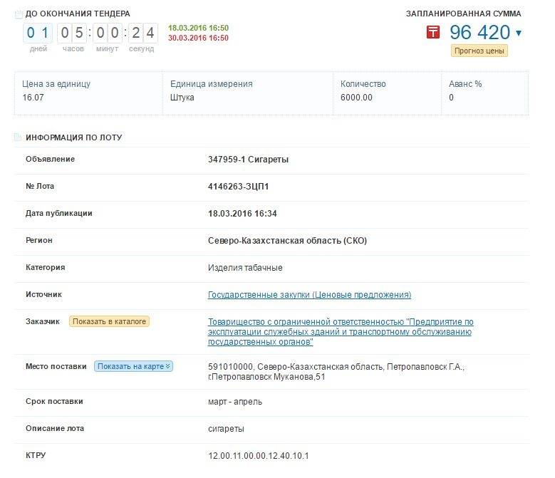Петропавловское ТОО "Предприятие по эксплуатации служебных зданий и транспортному обслуживанию государственных органов" объявило тендер на закупку сигарет. Объявления появились сразу на нескольких порталах.