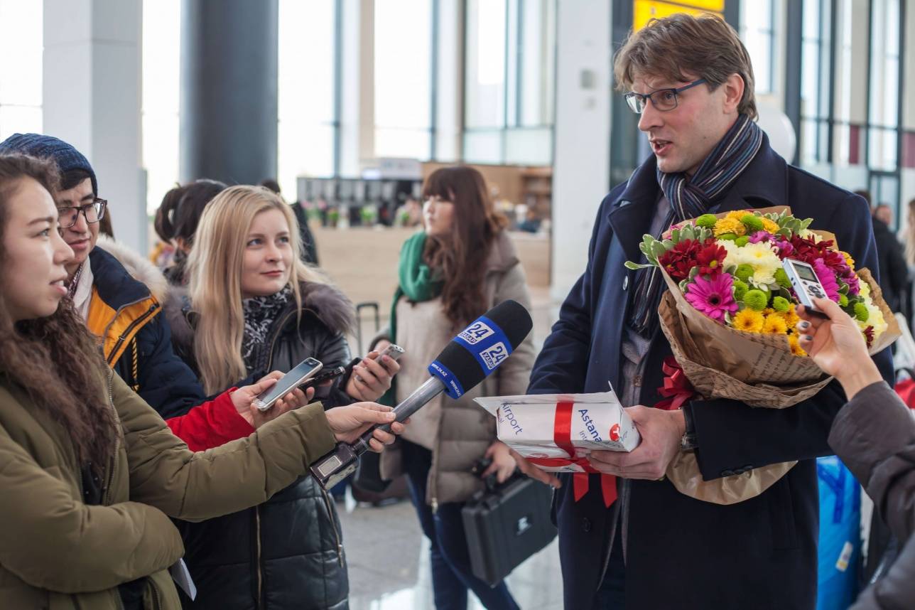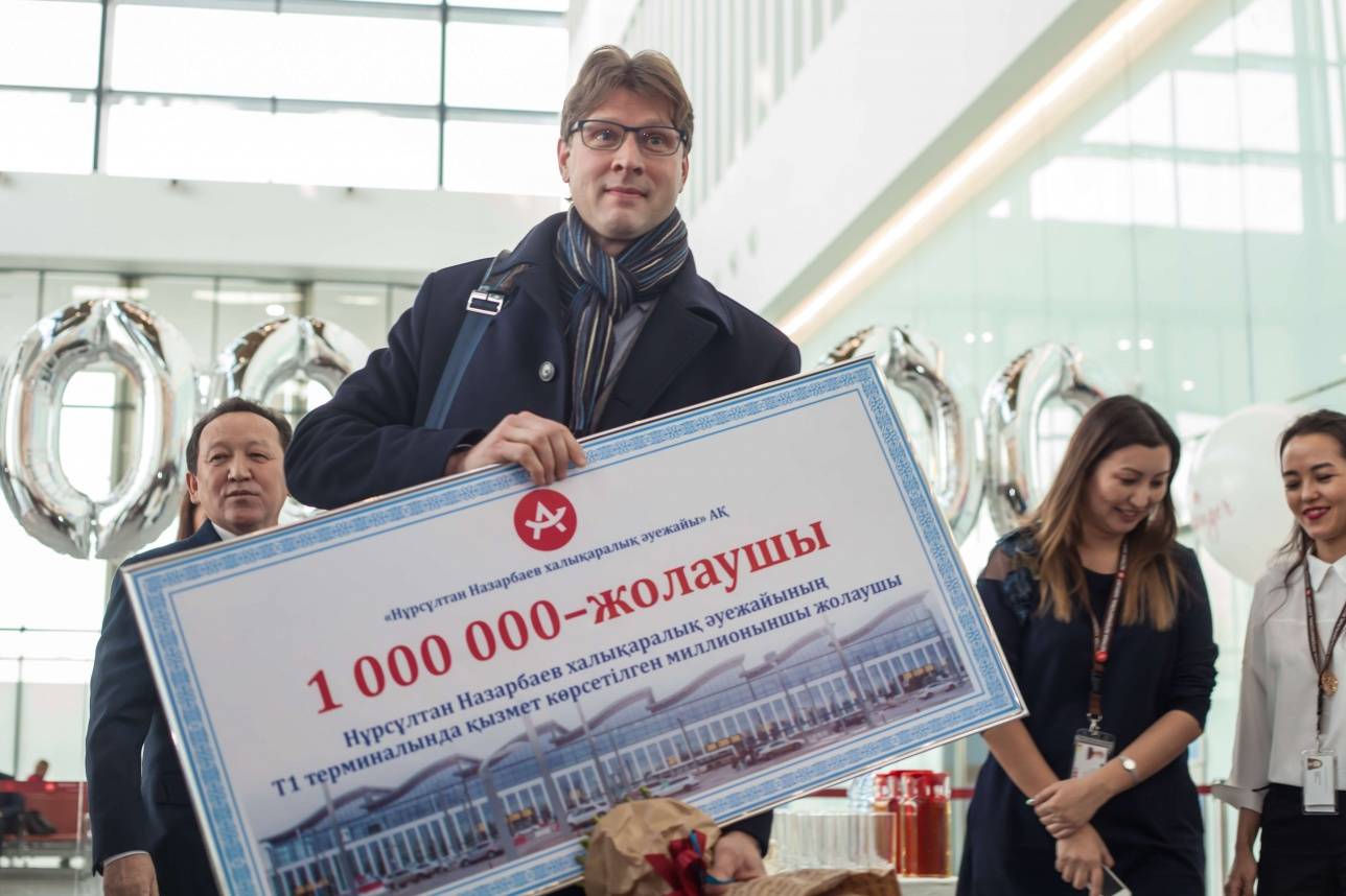 Почётным юбилейным пассажиром стал Алексей Французов, прилетевший из Новосибирска рейсом КС 218 авиакомпании Air Astana.