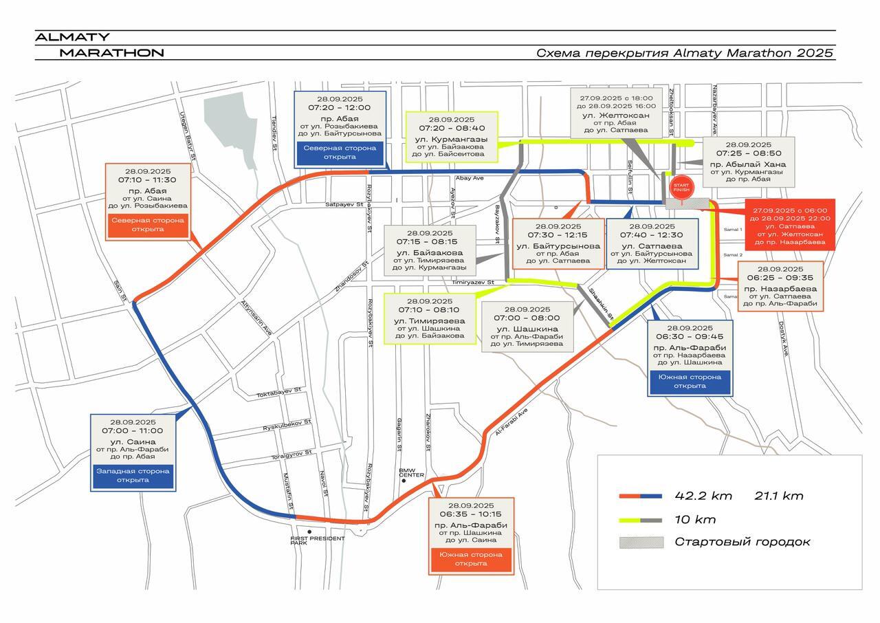- с 6.35 до 10.15 – проспект Аль-Фараби в западном направлении от улицы Шашкина до улицы Саина. Южная сторона улицы будет открыта. Альтернативный проезд в западном направлении – по Толе би и Абая;