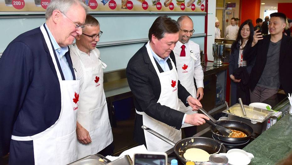 Затем гости праздника, болельщики и любители хоккея смогли продегустировать в холле арены традиционные канадские блинчики с кленовым сиропом. Самым большим счастливчикам удалось получить завтрак из рук Аскара Мамина, Игоря Ларионова, Кена Драйдена и других известных гостей.