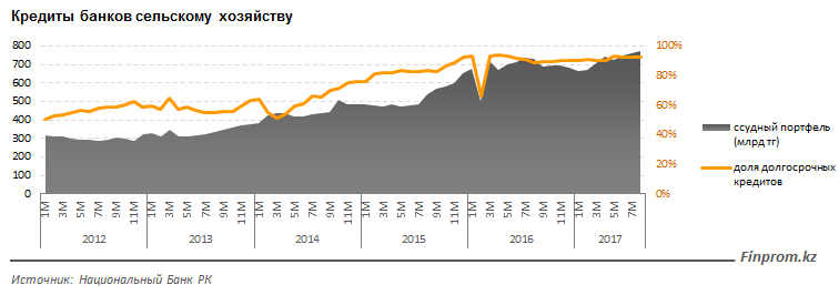 В целом весь кредитный рынок РК за год вырос на 2,9% и составил 13 трлн тенге на конец августа 2017 года. Доля сельского хозяйства в структуре банковских займов за год увеличилась на 0,1%.
