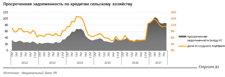 Выдача займов сельскохозяйственным предприятиям и фермерским хозяйствам увеличивается, несмотря на одновременное ухудшение их платёжной дисциплины. За год сумма просроченной задолженности по кредитам отрасли выросла в 2,5 раза, с 33,6 млрд тенге до 86,6 млрд тенге.