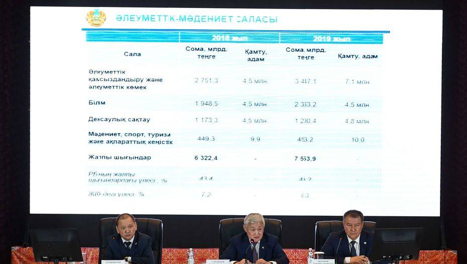 "Государство исполняет все свои социальные обязательства в полном объёме. На социальную сферу из республиканского бюджета направлено 45% республиканского бюджета. Руководством страны уделяется особое внимание улучшению уровня жизни населения, растут зарплаты, пенсии и пособия, строятся сотни объектов: школы, больницы, социальное жильё, ремонтируются дороги. Только за девять месяцев 2019 года на выплату АСП было направлено свыше 200 млрд тенге", – сказал Бердыбек Сапарбаев.