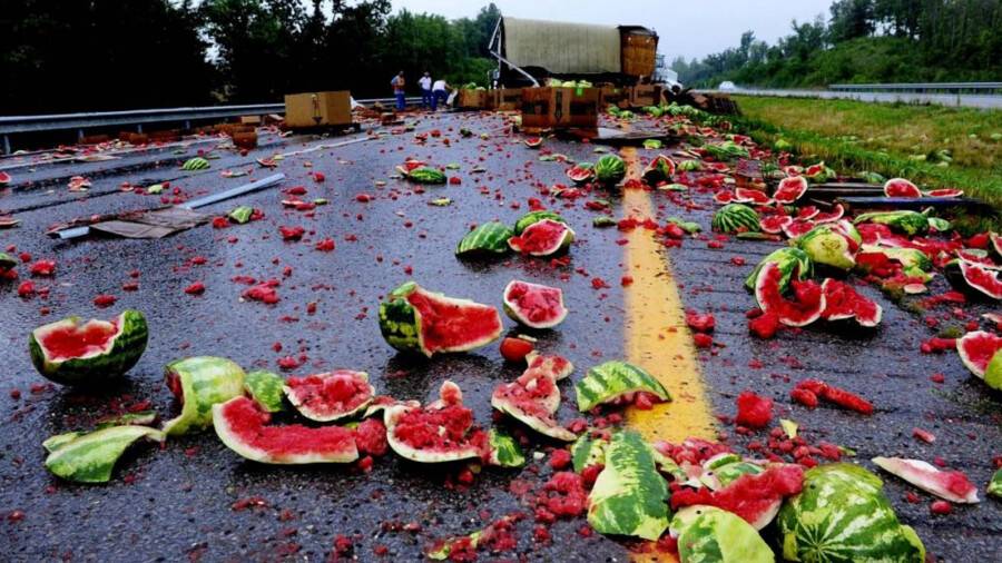 Кузов "ГАЗели" был доверху набит арбузами: все четыре тонны вдребезги разбились и рассыпались по дороге.