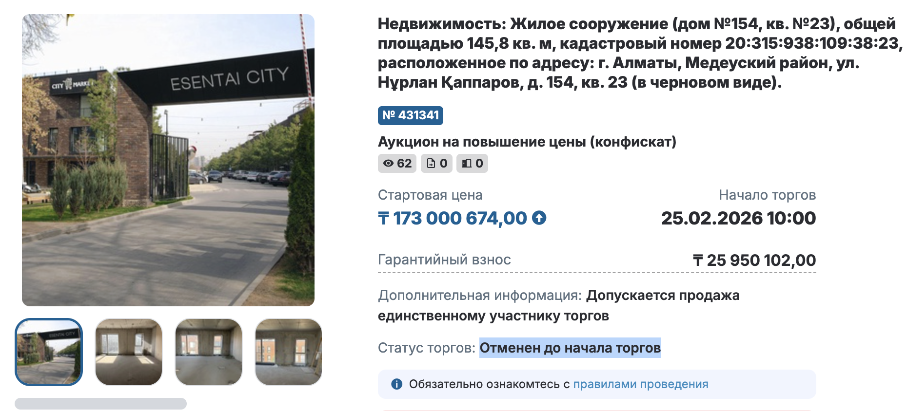16 жилых помещений в жилом комплексе Esentai Сity в Алматы, которые ранее выставили на продажу, сняли с торгов.