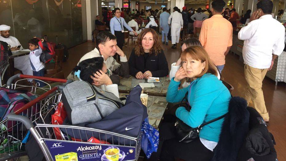 Казахстанцы на протяжении всего срока пребывания не получают еды и поддержки, некоторые из детей туристов заболели, их едва удалось пристроить на свободные кресла. Аэропорт Шарджи переполнен и другими пассажирами, люди вынуждены спать прямо на полу.