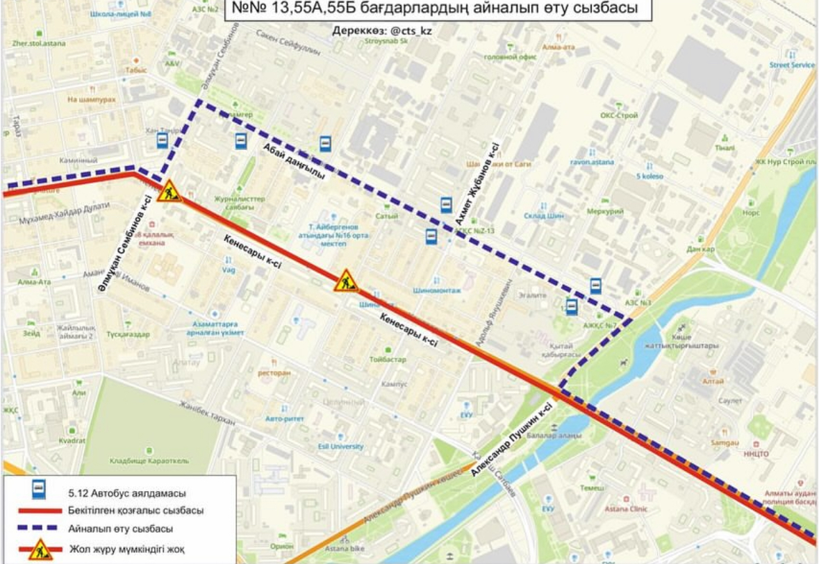 Автобусы №13, 55А и 55Б будут следовать по проспекту Кенесары, затем поворачивать на улицу Сембинова, проспект Абая, улицу Пушкина и проспект Абылай хана.
