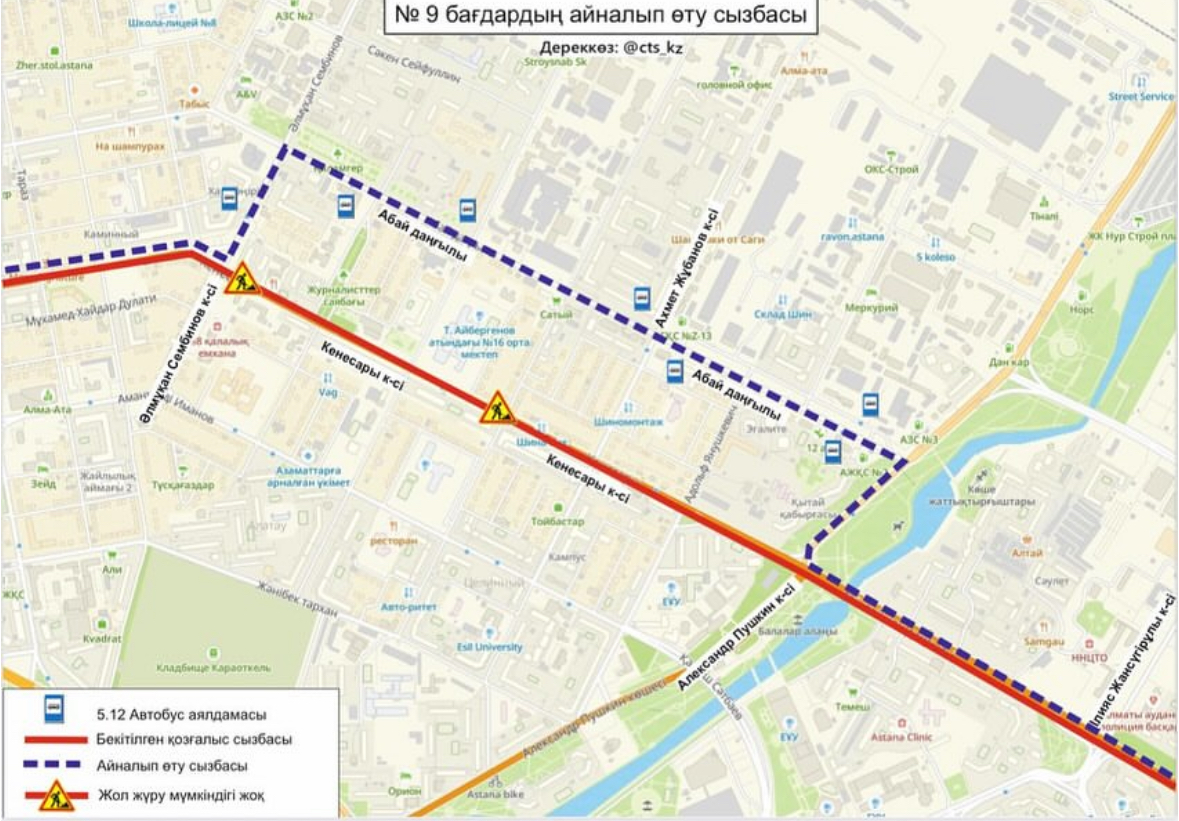 Маршрут №9 будет объезжать закрытый участок по проспекту Кенесары, улице Сембинова, проспекту Абая, улице Пушкина и проспекту Абылай хана.