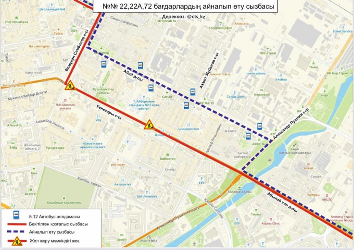 Для автобусных маршрутов №22, 22А и 72 объезд организуют по улицам Сейфуллина и Сембинова, проспекту Абая, улице Пушкина и проспекту Абылай хана.