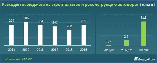 С началом сезона ремонтных и строительных работ расходы госбюджета на реконструкцию автодорог выросли в 4,4 раза. За март 2017 года они составили 11,8 млрд тенге.