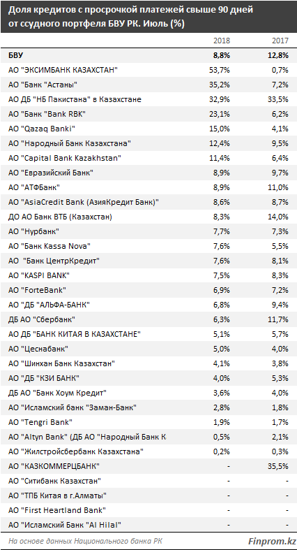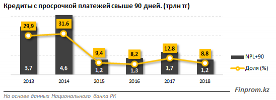 Кредиты с просрочкой платежей свыше 90 дней по итогам июля 2018 года составили в целом по банковскому сектору 8,8% от ссудного портфеля или 1,2 трлн тенге. Годом ранее этот показатель составлял 12,8%.