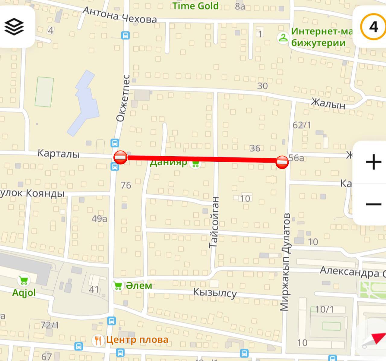 Также с 18 по 25 апреля частично перекроют движение по улице Карталы на участке от улицы Дулатова до улицы Окжетпес. Проезд организуют в обоих направлениях по одной из сторон.