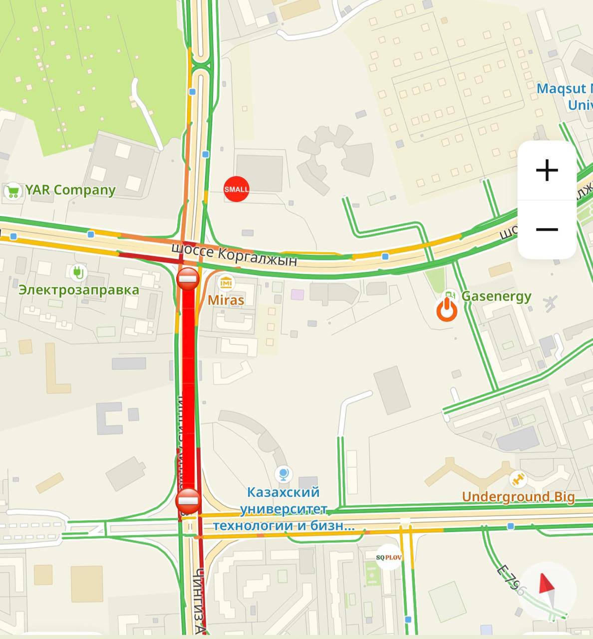 Проезд до 5 июля ограничили на отрезке от улицы Мухамедханова до шоссе Коргалжын. Движение организовали поэтапно в обоих направлениях по одной из сторон.