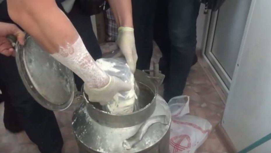 Обоих чиновников и представителя ТОО задержали и водворили в ИВС УП Усть-Каменогорска. На видеозаписи, предоставленной Антикоррупционной службой, запечатлён момент задержания подозреваемых. На кадрах видно, что взятку сотрудники службы обнаружили во фляге, наполненной мукой.