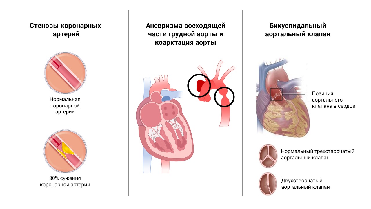 - врождённые пороки сердца (стеноз бикуспидального аортального клапана и критическая коарктация аорты),