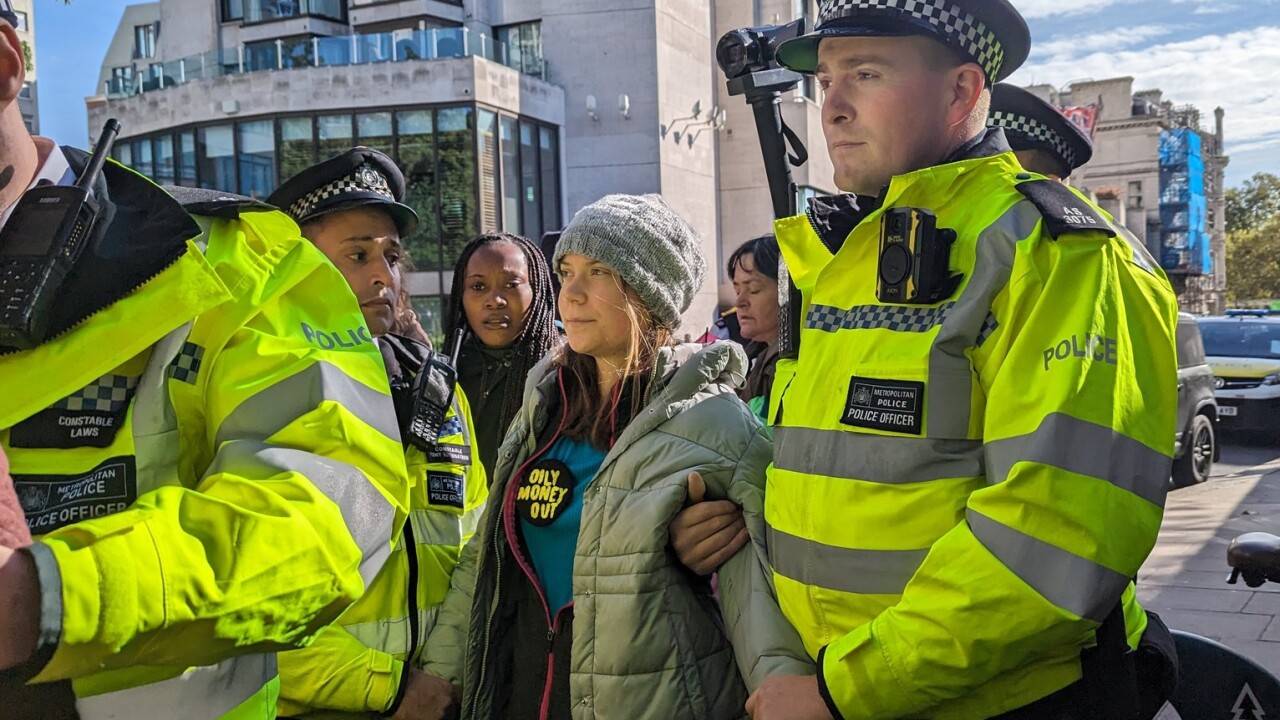BREAKING: Greta Thunberg has been arrested blocking the entrance to the Oil and Money conference.