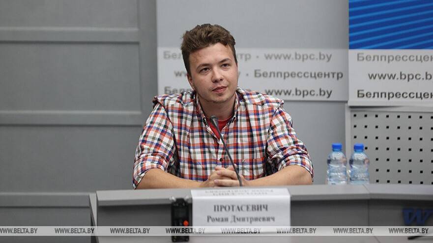Экс-главред Telegram-канала Nexta Роман Протасевич 14 июня стал участником брифинга в Минске по ситуации с посадкой самолёта Ryanair.