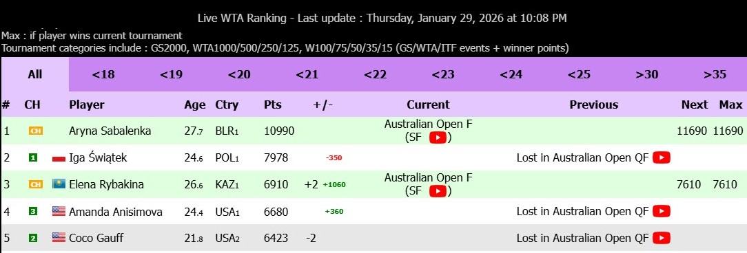 Первую строчку рейтинга занимает теннисистка Арина Соболенко, с которой 31 января Елене Рыбакиной предстоит сразиться за титул.