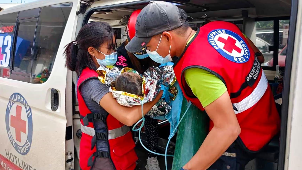 Филиппинский Красный Крест разместил в Facebook фотографии своих работников, которые несут девочку, завернутую в аварийное одеяло и подключенную к кислородному баллону, в больницу в муниципалитете Маваб.