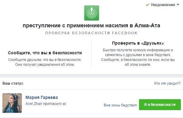 Поводом для активации "Проверки безопасности" послужила вооружённая атака на Алмалинское РУВД. Эта функция позволяет друзьям пользователя узнавать, всё ли с ним в порядке, после того как он оказался в непосредственной близости от места какой-либо трагедии. Также сервис предлагает оперативно получить нужную информацию и связаться с друзьями в зоне бедствия.